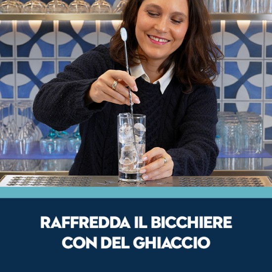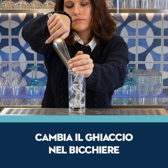 Cambiare il ghiaccio nel bicchiere, dopo averlo raffreddato, è un segreto da vero esperto del mestiere: infatti, questa operazione permetterà di liberare il bicchiere da qualsiasi residuo di ghiaccio eventualmente sciolto e di mantenere il drink fresco più a lungo.