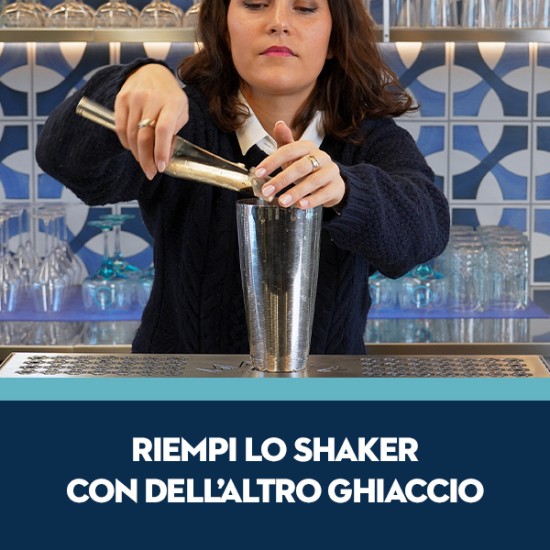 - Dopo aver raffreddato il bicchiere con del ghiaccio, riempi il TIN (pezzo) grande dello shaker con del ghiaccio;