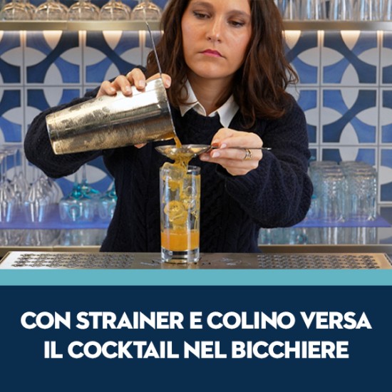 - Apri lo shaker e con l’uso dello Strainer e del colino versa il cocktail nel bicchiere (fermati a circa 3-4 dita dal bordo del bicchiere).